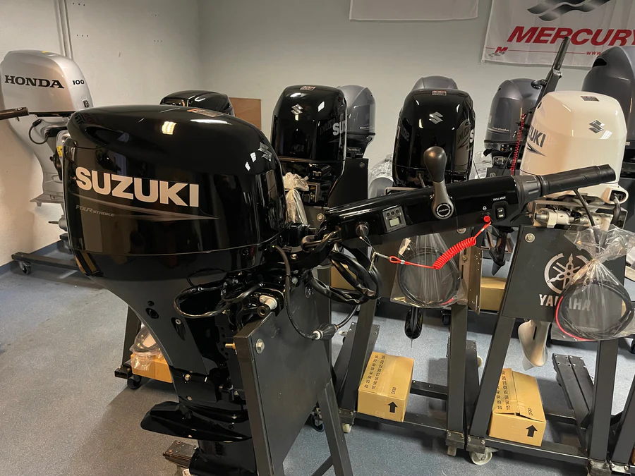 New Suzuki 60 HP outboard engine with tiller handle steering with extra high discount.